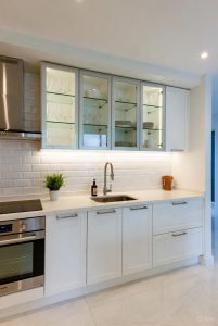 آینه کاری و نورپردازی بین کابینتها معجزه میکنه! استفاده از تایل آینه ای و شلنگ های ال ای دی که داخل فروشگاه مامان زیبا موجوده”هم شیکه هم فضا رو بزرگتر نشون میده.