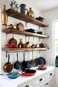 چند تا شلف دیواری چوبی یا رگال آویز برنجی بزن. قابلمههای مسی یا تابههای رنگی رو آویزون کن، هم دسترسی راحتتره هم آشپزخونهات شبیه مجلههای دکوراسیون میشه.